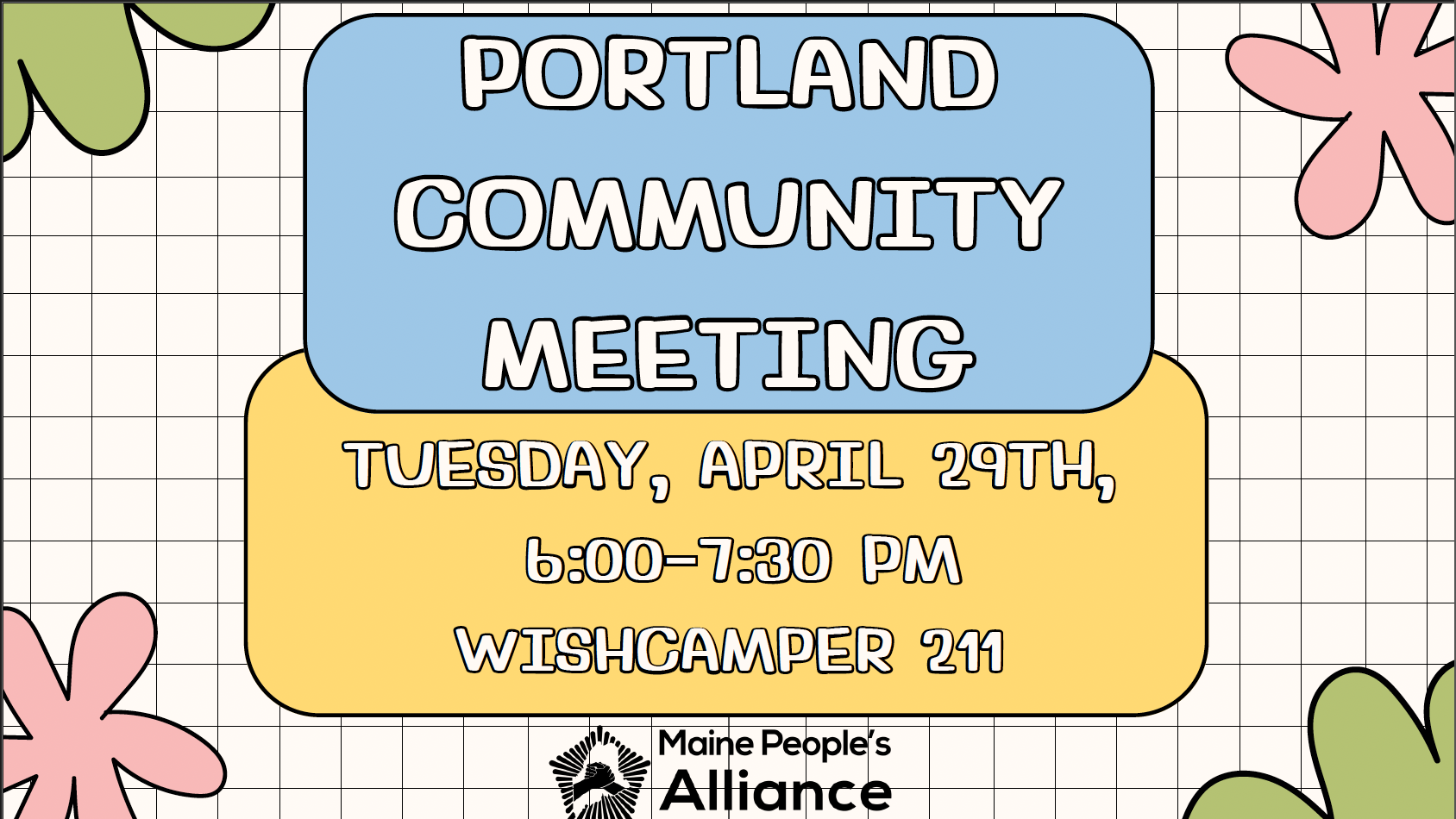 Join MPA members from Portland and surrounding towns as we work to take action in our community and move MPA’s work forward. This is an opportunity to connect with neighbors and build relationships with those passionate about social action. Dinner is provided, and please RSVP!
